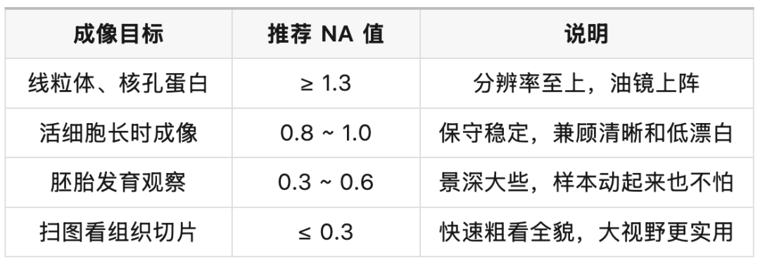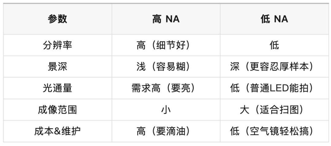 NA高 = 光线夹角大 = 能收更多光 = 分辨率高