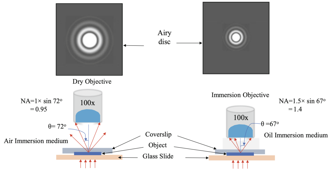 数值孔径(NA)为0.95的干式物镜和NA为1.4的油浸物镜的分辨率