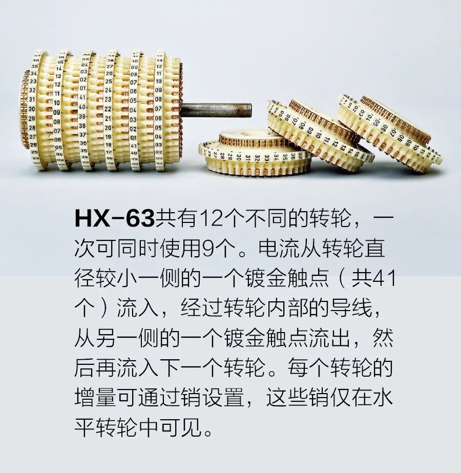 以下是HX-63的回注工作原理。在加密模式下,电流沿一个方向流过所有转轮,每个转轮都引入了一种独特的排列。在流过最后一个转轮后,电流通过同一个转轮再反向流经所有转轮。然而,当电流反向流经转轮时,它走的是一条不同的路线,即为此预留的15条额外电路路径。确切的路径不仅取决于转轮的接线,还取决于41个修改器的位置。因此,可能的电路配置总数是26!×15!,大约等于5.2×10381。而且9个转轮的每一条内部连接均有26!种不同的接线方式。此外,转轮的增量由41个机械销控制。综合起来,不同密钥的组合总数约为10600个。