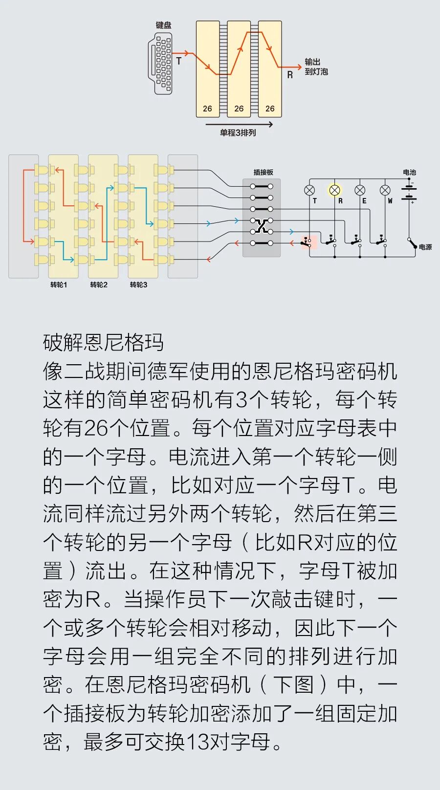 虽然这比简单的置换更具挑战性,但对于训练有素的密码分析员来说,破解这样一台简单的单转轮密码机简直是小菜一碟。所以转轮密码机使用多个转轮。例如,恩尼格玛有三转轮版,也有四转轮版。在操作中,每个转轮的移动间隔都与其他转轮不同:敲击一次按键可以移动一个或两个转轮,或者全部转轮。操作员为了进一步提高加密方案的复杂性,可选择在密码机中插入不同的转轮、使用不同的转轮接线。军用恩尼格玛也有一个插接板,可以在键盘输入和输出指示灯处交换特定的两个字母。