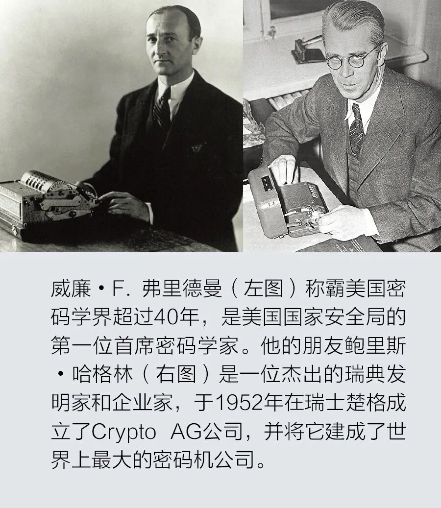 弗里德曼和哈格林是好朋友。二战期间,弗里德曼帮助哈格林成为一个非常富有的人。弗里德曼对哈格林的一台密码机提出改造建议,这为美军批准哈格林的专利铺平了道路,由此诞生的密码机M-209-B在战争期间成了主力,在战场上大约部署了14万台。20世纪50年代,弗里德曼和哈格林的亲密关系促使美国情报部门和这家瑞士公司达成了一系列被统称为“绅士协议”的谅解协议。哈格林同意不向美国情报部门列出的国家出售最安全的密码机,美国情报部门也可秘密获取CAG的各种机器、计划、销售记录和其他数据。