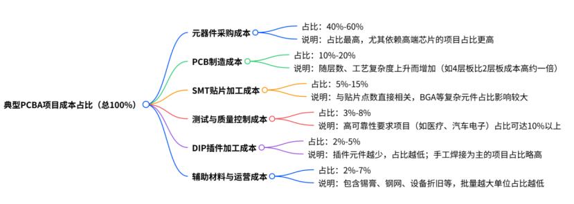 PCBA总成本 = PCB成本 + 元器件成本 × (1 + 损耗系数) + SMT成本 + DIP成本 + 测试成本 + 包装物流成本 + (利润 & 管理费)