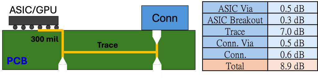 假设你的电路设计是ASIC(或GPU)通过PCB走线连接到Connector,而这条通道的最大损耗规格是9dB,那么我们就可以开始拆账: