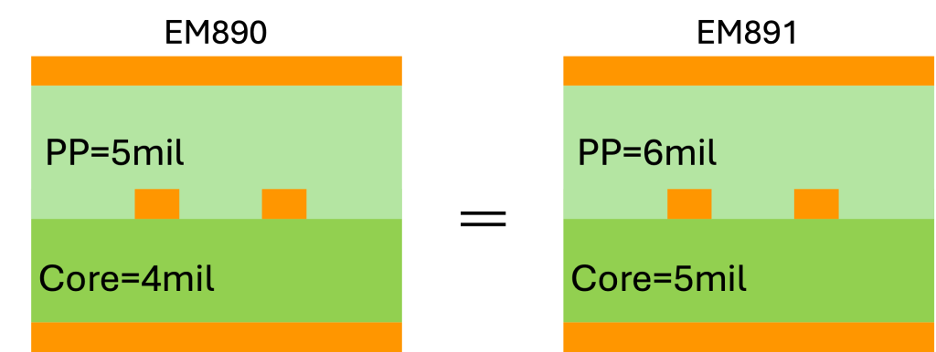 EM890在Core/PP=4/5mil的条件下,跟EM891在Core/PP=5/6mil的条件下,两者的损耗是相同的,但是EM891却有着相当好的价格,这就是前面我们在说的,透过改变Core/PP厚度配比,达到节省PCB材料价钱的方法!