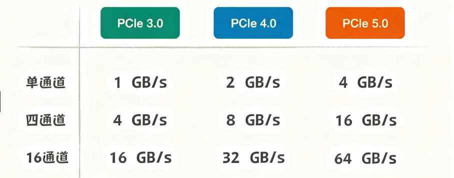• 车速(Gen):PCIe 3.0、4.0、5.0就是限速,每一代车速翻倍。