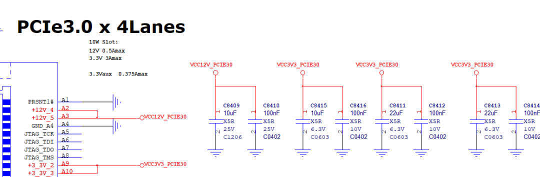 PCIe设备通常需要多组电压:3.3Vaux+3.3V+12V等。