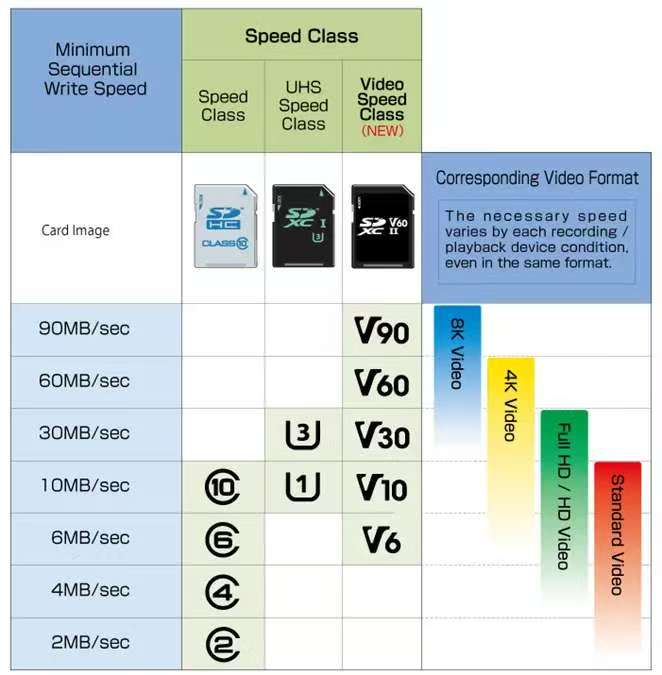 SDXC卡以超高速运行,并以最高30 Mb/s的速度运行;还有视频速度等级,数据传输速率高达90MB/s。