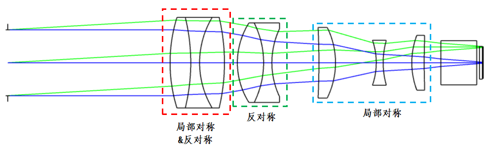 对称设计指系统关于光阑平面近似镜像对称,如双高斯结构。其最大优势在于对奇像差的被动抵消机制。