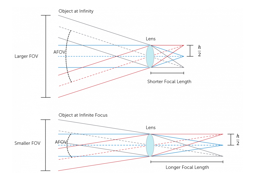 镜头的焦距表示镜头与图像传感器上聚焦图像之间的距离。当光通过镜头时,它要么会聚集 (正焦距),要么会发散(负焦距),但在相机内,焦距主要是正的。焦距的距离决定了镜头汇聚光线的强度,同时也会影响到捕捉光线的水平角度。这里要提出一个概念,固定视场角(AFOV),是指在水平方向捕获的任何光线与在边缘捕获的任何光线之间的角度。如果图像传感器的尺寸不变,改变焦距将改变 AFOV,从而改变整体 FOV。更短的焦距提供更大的 AFOV 视图,也能提供更大的 FOV。