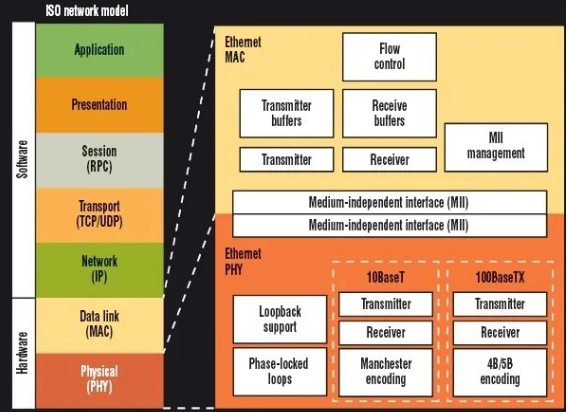 IEEE-802.3标准定义了以太网PHY。包括MII/GMII(介质独立接口)子层、PCS(物理编码子层)、PMA(物理介质附加)子层、PMD(物理介质相关)子层、MDI子层。它符合IEEE-802.3k中用于10BaseT(第14条)和100BaseTX(第24条和第25条)的规范。