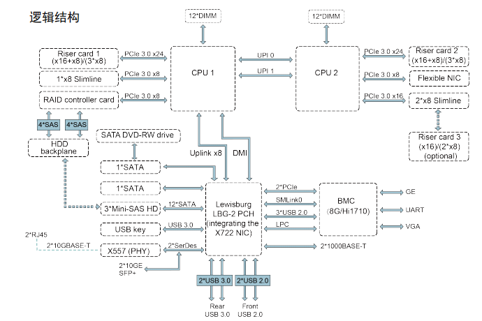 板载RAID扣卡通过PCIe总线跟CPU1连接,RAID卡出SAS信号线缆跟硬盘背板连接,通过不同的硬盘背板可支持多种本地存储规格;使用LBG-1桥片,支持2个板载GE电口。