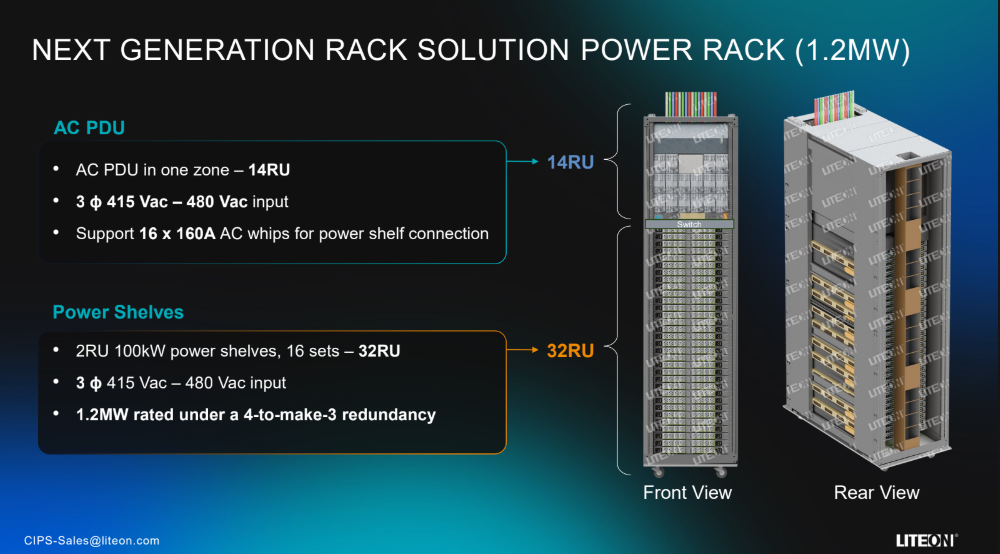 现在我们再看 Lite-On 的 1.2MW Power Rack,就更能感受到行业正在往哪里走。这个 Power Rack 可以说是专为 GB300、未来 GB400 甚至下一代 AI 服务器打造的基础设施。它由 16 套 100kW 的 800VDC shelf 组合而成,通过 4-to-make-3 的冗余方式实现 1.2MW 输出,内置智能化监控、在线升级、安全防护、800VDC 触点绝缘等,很明显,它不是“更大号的电源”,而是完整的电力系统单元——未来机房就是用这一类模块堆出来的。随着 GPU 发展从单机到整柜,从整柜到整列,电源也在同步从 in-server → in-rack → sidecar 迈进。