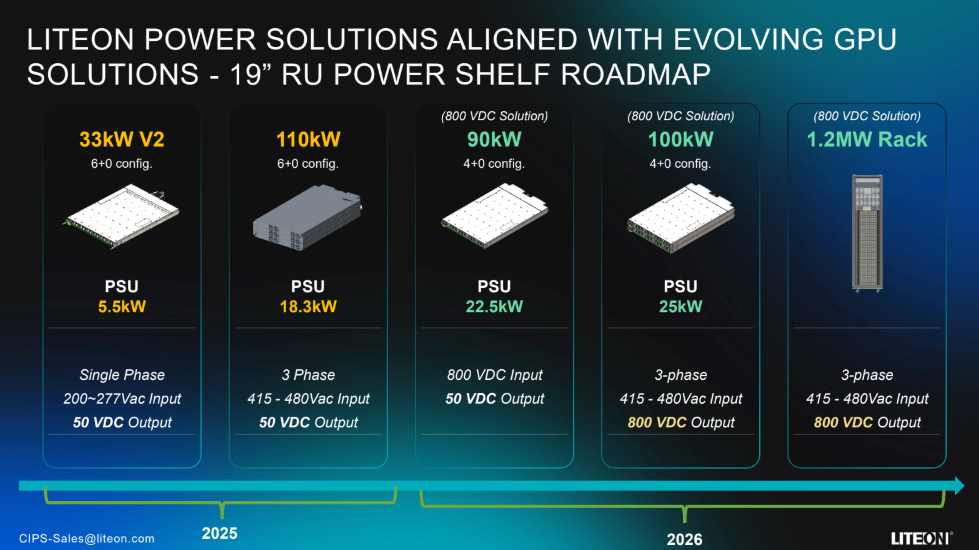 Lite-On 的电源路线图也很清晰:原本的33kW、110kW Power Shelf 已经在 A100、H100 时代被大规模采用,现在则开始全面转向 800VDC 解决方案。原因很简单——未来的 AI 集群功率越来越夸张,50V 母线已经撑不住了,要么电缆粗到不现实,要么传输损耗大到浪费。所以行业几乎达成共识:要进入 300kW~1MW 的整柜时代,就必须走向 800VDC。 Lite-On 不但跟上了,还直接推出了完整的 800VDC 线:从 PSU、Shelf、Rack 到 1.2MW 的侧挂机柜,一口气把“未来电源的样子”摆在了桌面上。