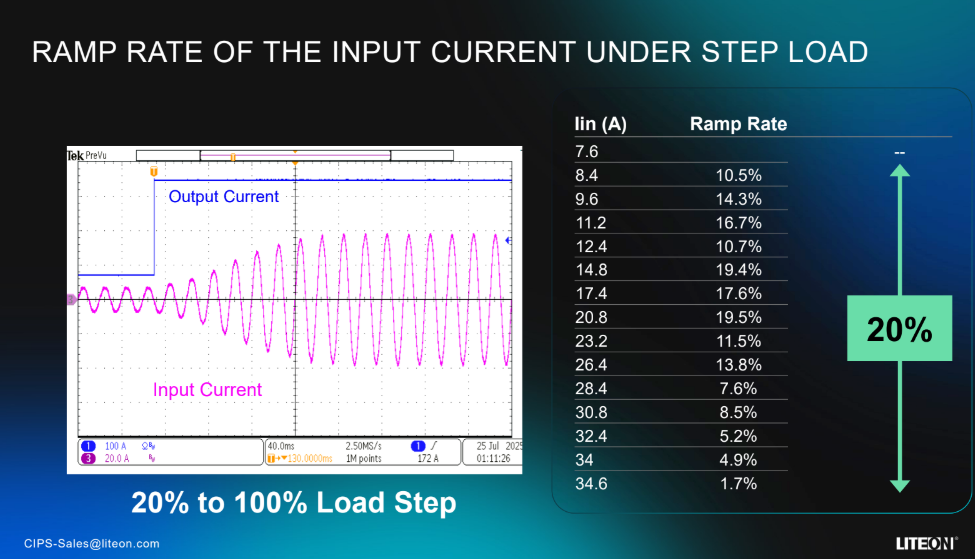 Lite-On 的新款 110kW Power Shelf 采用三相整流,天然具有输入电流均衡和纹波抵消的优势,这让电容压力骤降,能量存储密度反而翻倍。不仅如此,它在 step loa时的输入电流斜率也更平滑,这直接决定了整个系统在模型训练阶段的稳定性。