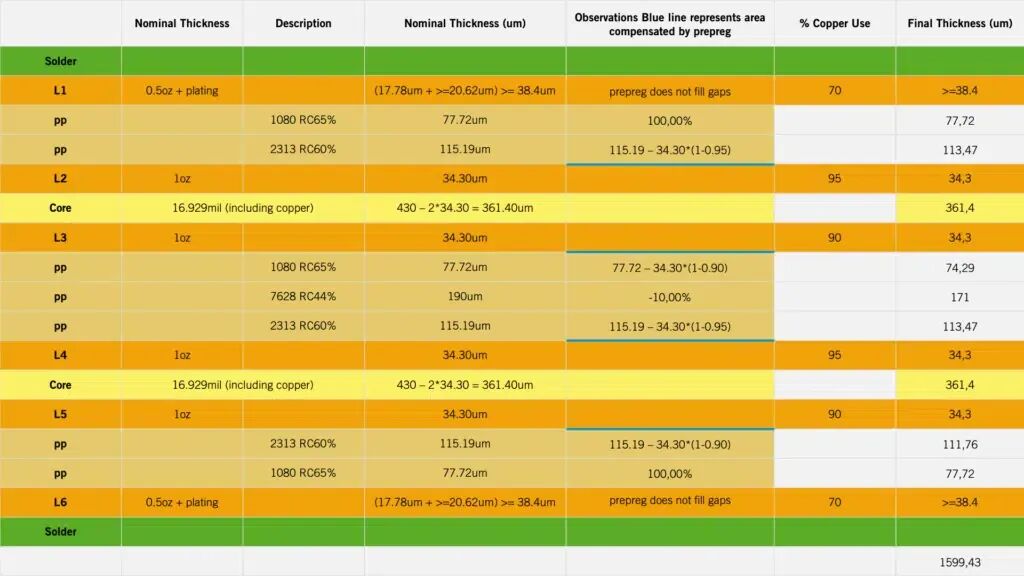 PP变薄会使信号参考层更接近走线层,从而降低特性阻抗。因此必须使用材料数据表与残铜率(蚀刻后剩余铜面积比例)来重新计算最终厚度。