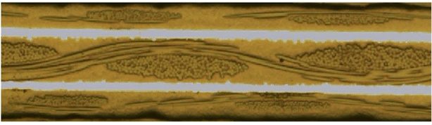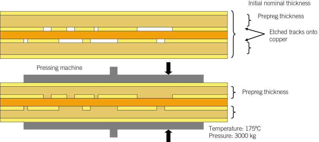 完成堆叠后,整体会在真空辅助热压机中以175℃(高于Tg约30℃)、3000kg/sqm压力层压约2小时,使其固化为整体。此过程会导致PP明显变薄,这是许多PCB设计工程师经常忽略的:熔融树脂会填充蚀刻后留下的铜线间隙,因此最终厚度往往小于预期厚度。