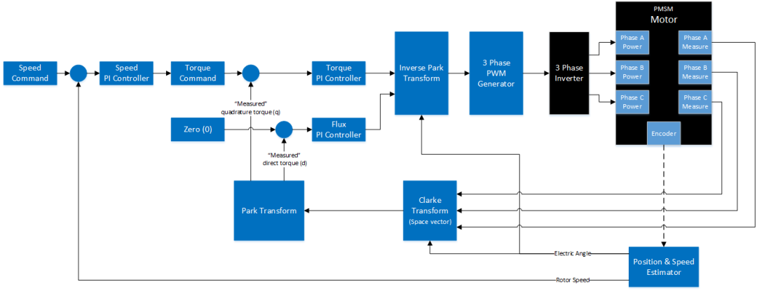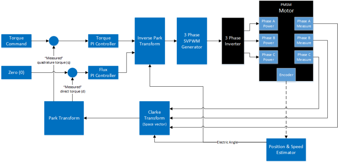 转矩控制采用闭环控制,旨在维持指定的转矩值。在这种运行模式下,q矢量提供电机的有效转矩输出,d矢量提供平行于转子的力。d矢量代表直接或非旋转力矢量,在非弱磁控制场景中,其值围绕零设定点进行控制。