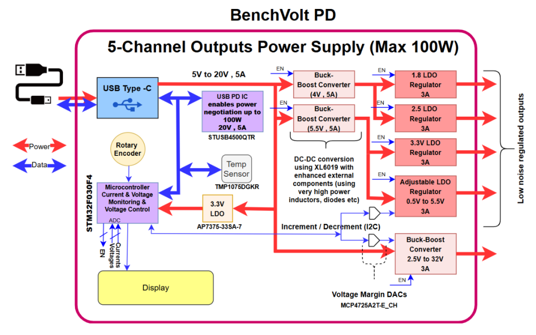 BenchVolt PD是一款开源USB-C供电的多通道实验室电源,最大输出功率达100W。具备5路输出(0V-32V)、STM32控制、USB-PD协议、低噪声LDO稳压器及Python图形界面。