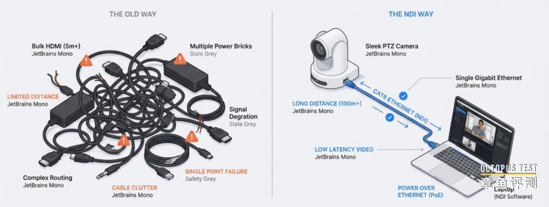 如果你的摄像机具备NDI功能,只需要一根网线就可以把视频通过网络传输给导播设备。同时,NDI定义了摄像机的控制协议,可以通过网络控制摄像机的云台和焦距。