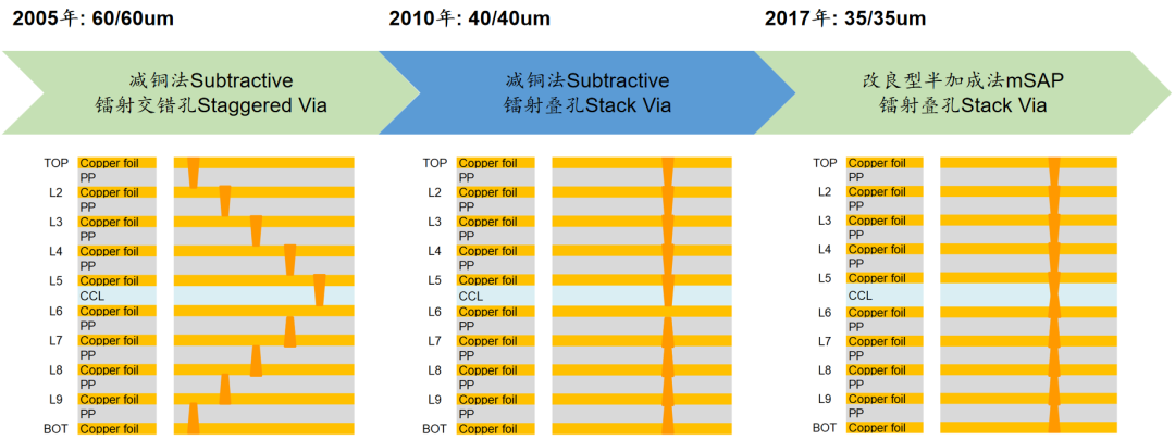 为了更好地说明mSAP与SLP之间的关系,这里先带大家回顾下高密度互联HDI(High Density Inter-connection)板的发展历程。