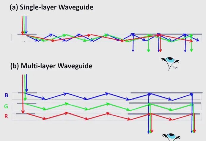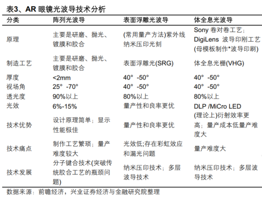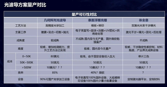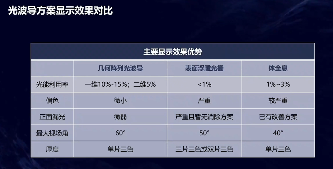 在色彩均匀性(无彩虹效应)和实现单片全彩波导上均有优势,但是目前在大规模量产和大视场上受到了限制。