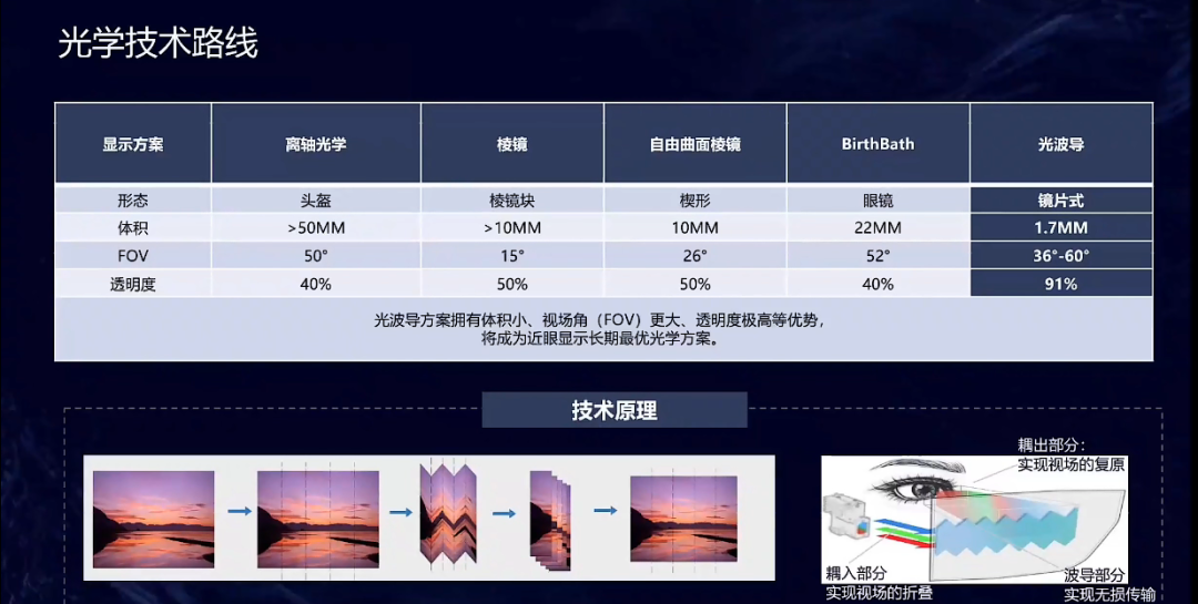 一般包括锯齿结构波导、偏振薄膜阵列反射镜波导(简称偏振阵列波导)。其中主流的偏振阵列波导是使用阵列的部分透射部分反射薄膜镜来达到虚拟信息的显示的目的,偏振阵列波导方案具有轻薄、眼动范围大且色彩均匀的优势。