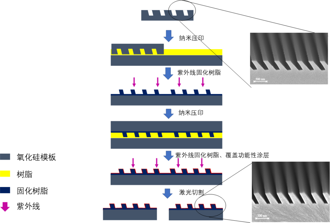具体工艺流程如图15所示,该工艺可分为两个阶段:纳米压印工作模具制备阶段和批量生产阶段。首先,通过上述模板制备工艺将图案加工到硅晶圆上以用作模板,通过纳米压印技术在更大的硅晶片上旋涂UV树脂并在上面印刷更多的模板。然后使用紫外线对印刷的结构进行曝光以固定树脂。最后通过重复上述过程批量生产多图案的压印模具。在批量生产的过程中,使用多图案的模具来生产表面浮雕光栅波导,然后使用功能性涂层覆盖波导,并用激光切割技术分离,最后将不同结构的波导堆叠实现光学模组的制备。