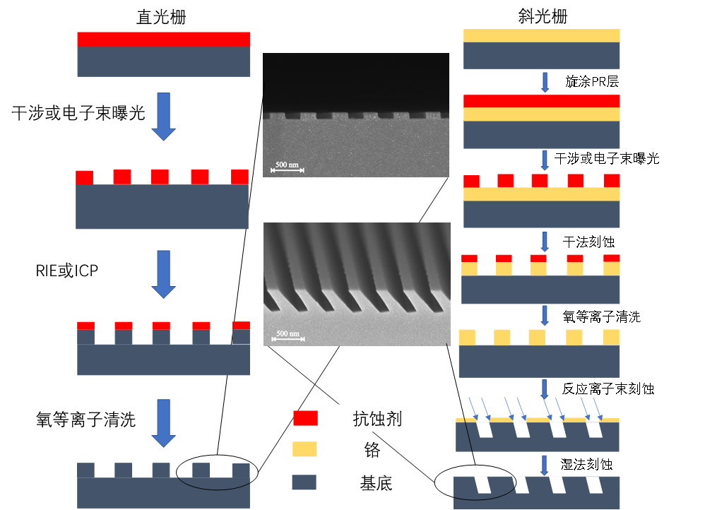 图14所示为表面浮雕光光栅模板制备或小批量制备工艺流程图,包括其扫描电镜图。对于直光栅,其工艺较为成熟,首先在基底上旋涂抗蚀剂层,通过干涉曝光或电子束曝光实现光栅的图案化,之后利用反应离子刻蚀(RIE)或电感耦合等离子体刻蚀(ICP)将图案转移到基底,并将抗蚀剂层去除,完成直光栅的制备。