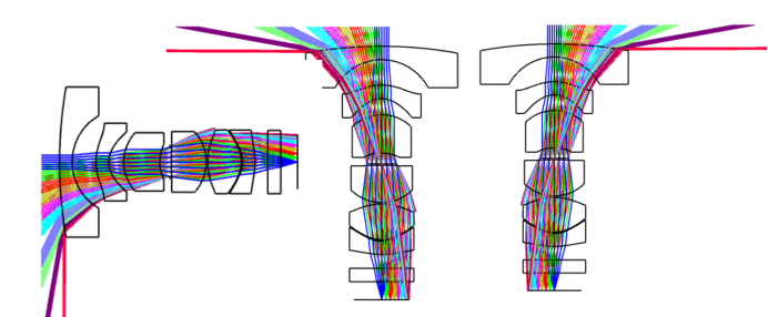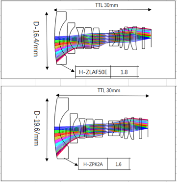 3、 第一个弯月负透镜尽量用高折射率的材料,在高折射率的加持下,光焦度大,偏折光线能力强,且不会通过弯曲镜片曲率来达到提升光焦度有利于镜片的偏心,倾斜公差的敏感度提升,同时高折材料有利于镜片口径及系统长度减小,如图10,鱼眼镜头首片弯月负透镜高折与低折的差异,导致口径相差3.2mm;