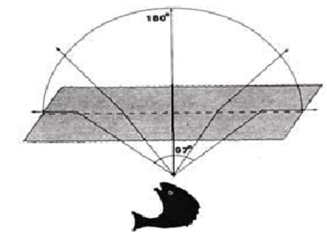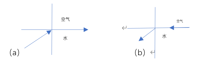 由光路可逆性,贴近水面入射的光线,将会以等于折射角的角度进入水面,如图3(b)。故鱼在贴近水面看,可以看到水面上方180°角空域的景物。