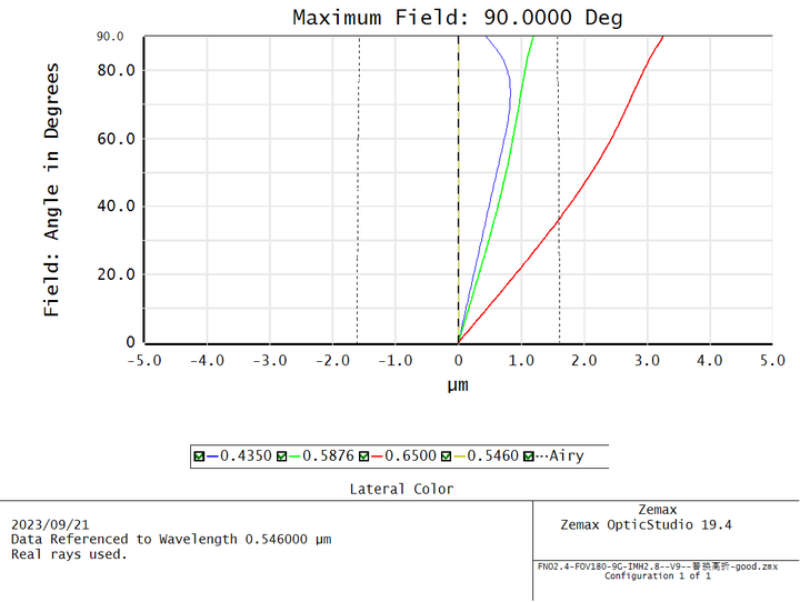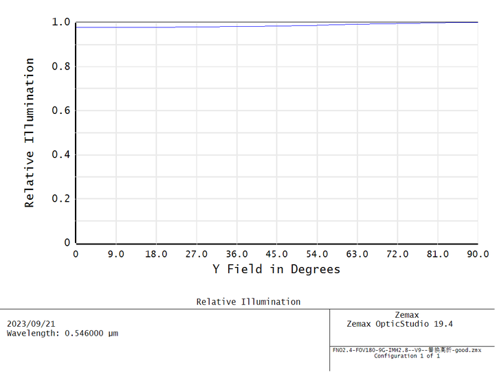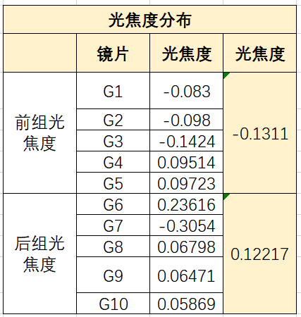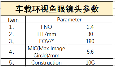 特点是本身具有大量桶形畸变的反摄远架构系统,即前负后正的光焦度的架构,见图5-1前后镜组光焦度负正体现,及各自光焦度分配。通常鱼眼镜头前负透镜组的前表面向前凸出同第一镜片的第二面曲率要大于第一面,这样透镜大多呈现“帽子”形状,弯月帽型,主要作用使入射光线强度和视场角足够大。鱼眼镜头的第一透镜通常采用玻璃材质,且选择硬度高、易加工、化学稳定性强的材质,如CDGM的H-ZLAF50E,H-ZLAF50B,H-LAK52为不错的材料。本案例的鱼眼镜头参数如下: