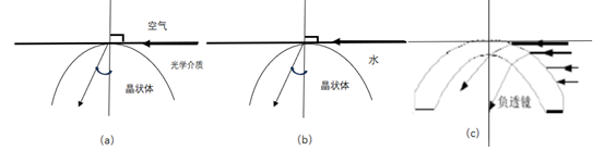 如图4-a可将鱼眼晶状体和光学介质当成一个光学结构整体,将晶状体前表面与水平面构成一个以水为介质的平凹透镜,若改成高折射率的材料替代水介质,构成一个光学透镜,则可能在水平上实现大范围成像的功能。如图4-b,为进一步扩大视场角,将平凸透镜的前表面改为凸面并且增大后曲面的曲率,保证光焦度的变化量不大,来构成一个弯月负透镜如图4-c。从该演化的结果可看出,鱼眼镜头的演化第一片多为类似抛物线形且外凸的负透镜。
