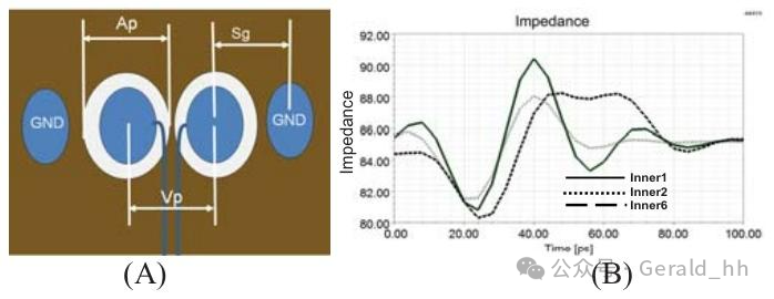 图2. (A) 差分对过孔的俯视图 (B) 不同层转换的模拟阻抗图