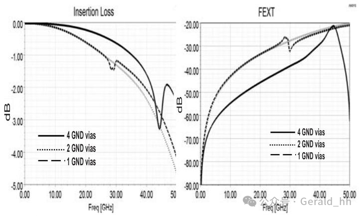 图4. 不同转换过孔图案之间模拟的远端串扰(FEXT)对比。