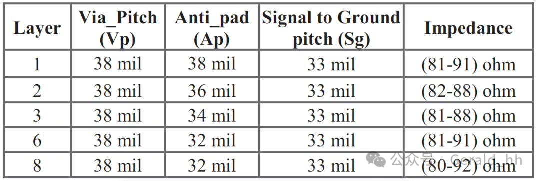 反焊盘是指信号过孔与接地/电源平面之间的区域,这对于确保信号过孔不会与其他非信号层短路是必要的。反焊盘的大小和形状将决定阻抗不连续性。在高速数据速率下,由于各层因平面而具有不同的电容,其阻抗也相应不同,因此不能对所有过孔转换采用相同的反焊盘,如图2(B)所示。表1显示,优化阻抗是反焊盘(Ap)、信号到地距离(Sg)、过孔间距(Vp)和材料特性共同作用的结果,如图2(A)所示。