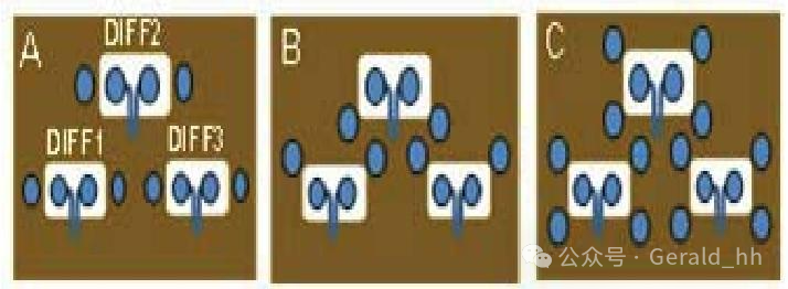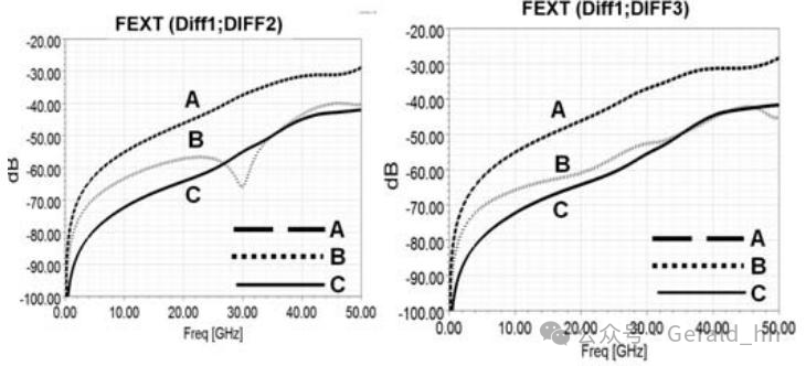 需要在PCIe信号转换过孔附近放置接地过孔,以获得良好的信号返回路径和串扰屏蔽。在PCIe Gen4中,通常两个对称的接地过孔就足够了。在这项研究中,分析了两个和四个相邻接地过孔结构,以了解它们的串扰屏蔽性能。三种结构如图3所示,它们的FEXT比较如图4所示。结构(A)和(B)在PCIe转换过孔附近有2个接地过孔,但它们的接地过孔位置不同。由于结构(A)在DIFF1和DIFF3对之间有两个接地过孔,所以它在DIFF1和DIFF3之间具有更好的抗串扰能力。另一方面,结构(B)在DIFF1和DIFF2之间具有更好的串扰性能。然而,与两个接地过孔结构相比,四个接地过孔结构(C)具有最佳的串扰性能。