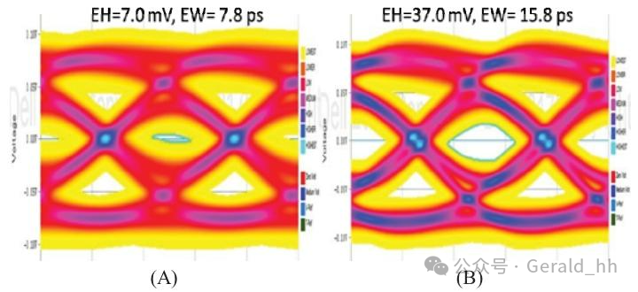 本节使用两个PCIe通道来展示最优和常规通道设计在眼图张开度上的差异。最优通道采用了第三节中的所有最佳设计实践,而常规通道则采用常规设计实践。单个通道模型被级联以得到如图9所示的通道模型。该通道是一个PCIe Gen5 Tx通道,包括一个适配器、一个交流电容和两个PCIe连接器。平面和适配器上的走线长度分别为4英寸和2英寸。最优通道使用Inner1过渡过孔、5密耳的芯层和6密耳的预浸料。连接器和过渡过孔有4个相邻的接地过孔。常规通道使用Inner8布线、3密耳的芯层和4密耳的预浸料。连接器和过渡过孔只有2个相邻的接地过孔。两个通道的走线长度相同。级联模型显示,与常规通道相比,最优通道的损耗低3dB,远端串扰(FEXT)和近端串扰(NEXT)低10dB。两个通道的眼图如图10所示,最优通道的(眼高/眼宽)为(37.0mV / 15.8ps),常规通道为(7.0mV/7.8ps)。