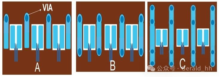 图5. (A)在内侧放置单个接地过孔,(B)在两侧各放置两个接地过孔,(C)在两侧各放置四个接地过孔。