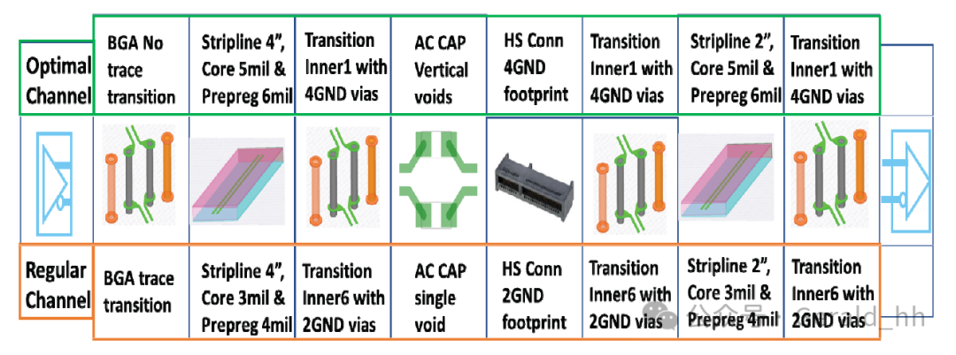 在这项研究中,分析了几个通道参数以优化PCIe Gen5通道。采用了具有8个信号层的20层叠层结构。芯层和半固化片厚度分别为5密耳和6密耳。总板厚为120密耳。除了顶层在引出区域周围有非常短的走线外,所有PCIe Gen5信号都在内层布线,并由两个相邻的接地(GND)层屏蔽。所有通道都保持10密耳的过孔短截线。