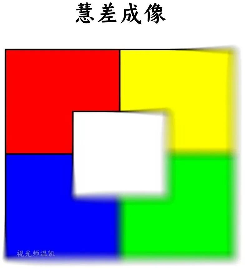 彗差 像彗星一样的拖尾成像,原因是由于透镜的不同位置,对于轴外光线的偏折角度不同,导致焦点出现渐变状的“拖尾”成像。 如上图,当你注视红色色块时,越偏离红色的区域,成像越模糊。