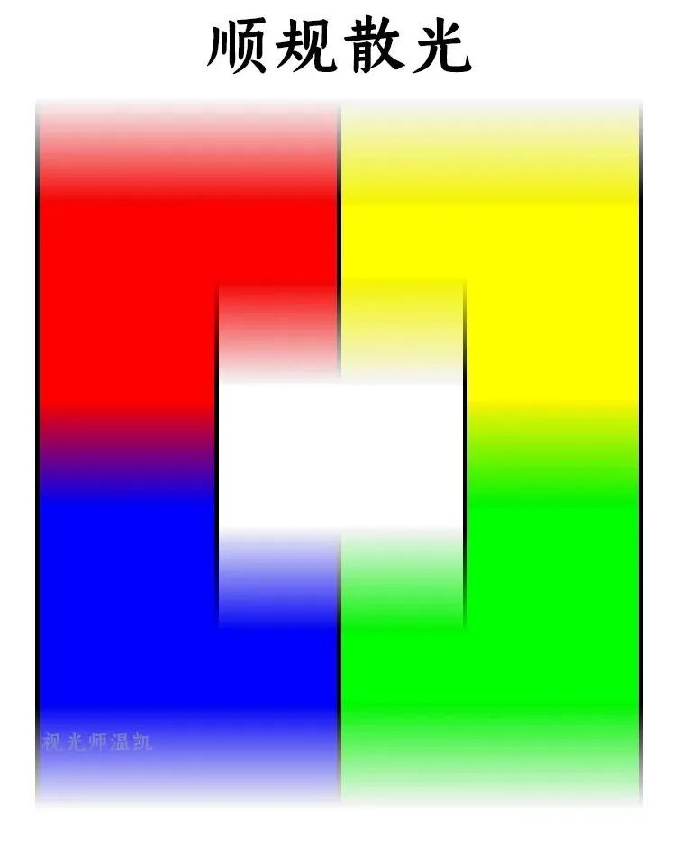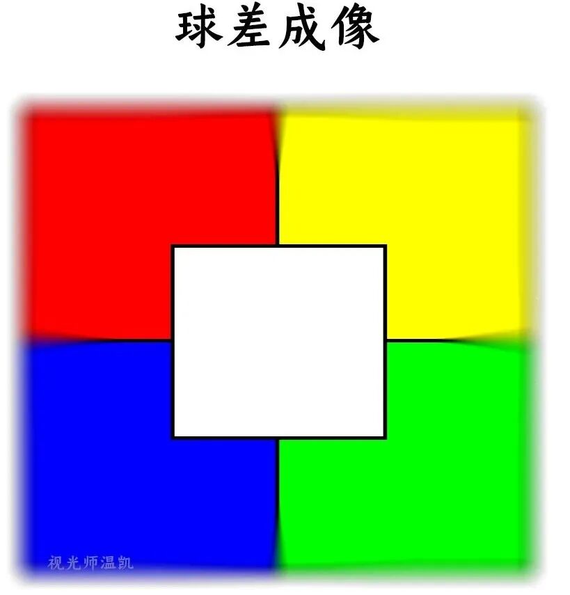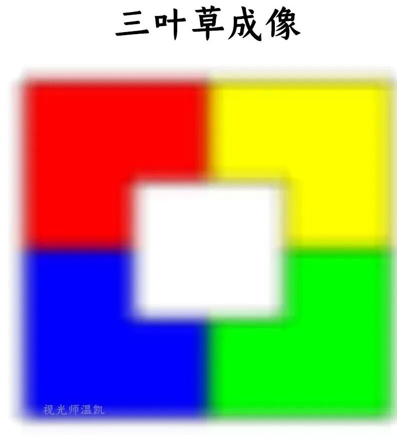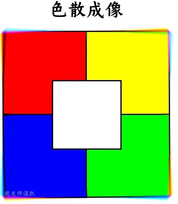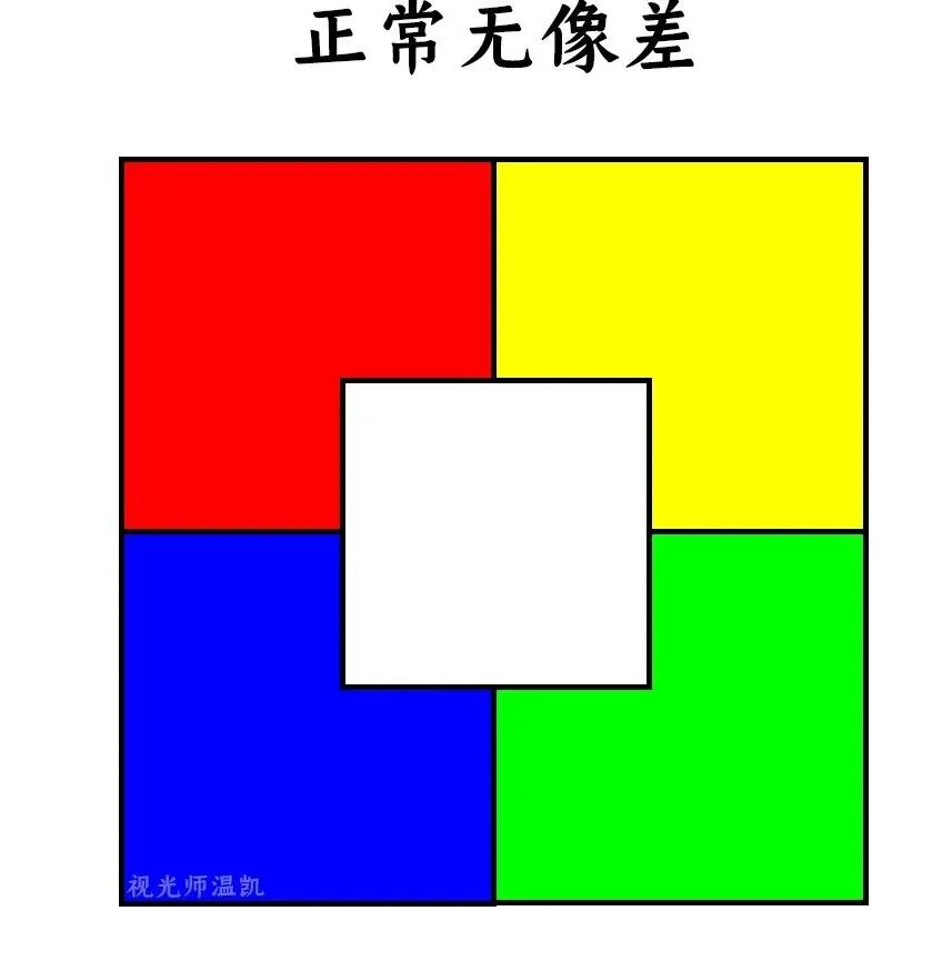 正常完美成像 红、黄、蓝、绿四种色块在后,白色色块在前,边缘清晰。 “完美”的成像,在自然界中并不存在。