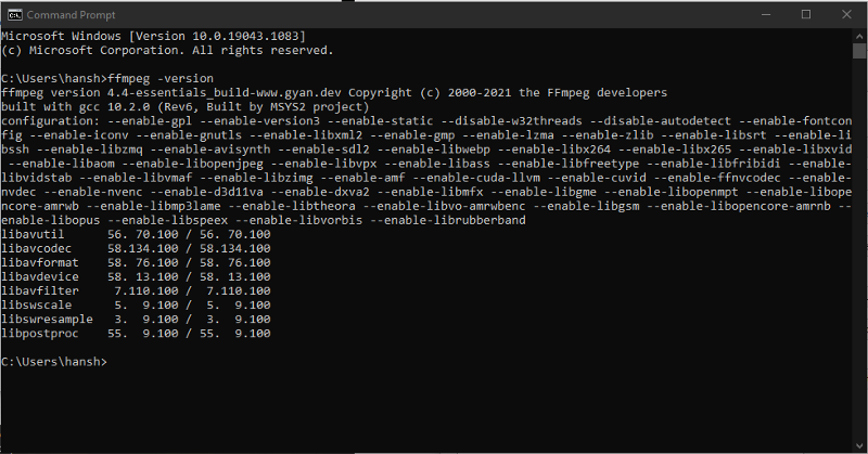 • 打开命令提示符并键入ffmpeg -version. 如果你看到打印出 FFmpeg 版本,则表示 FFmpeg 安装成功。我们还可以检查ffprob -versionffplay -version