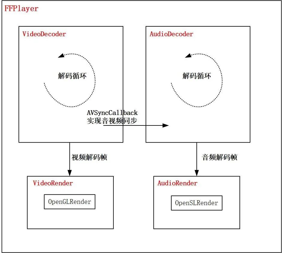如上图所示,音频解码和视频解码分别占用一个独立线程,线程里有一个解码循环,解码循环里不断对音视频编码数据进行解码,音视频解码帧不设置缓存 Buffer , 进行实时渲染,极大地方便了音视频同步的实现。