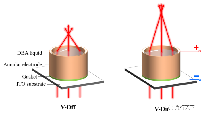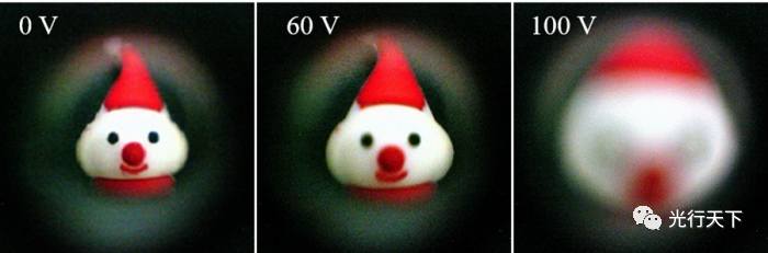 该透镜是通过在一个环形电极上填充这种DBA液体而产生的。由于电极上涂有一层防水层,液体的表面形成一个圆顶形状。当对其施加电压时,DBA分子聚集在管子的一端,改变了圆顶,并因此改变了镜头的焦距。当电场被移除时,液体恢复到其原始形状。