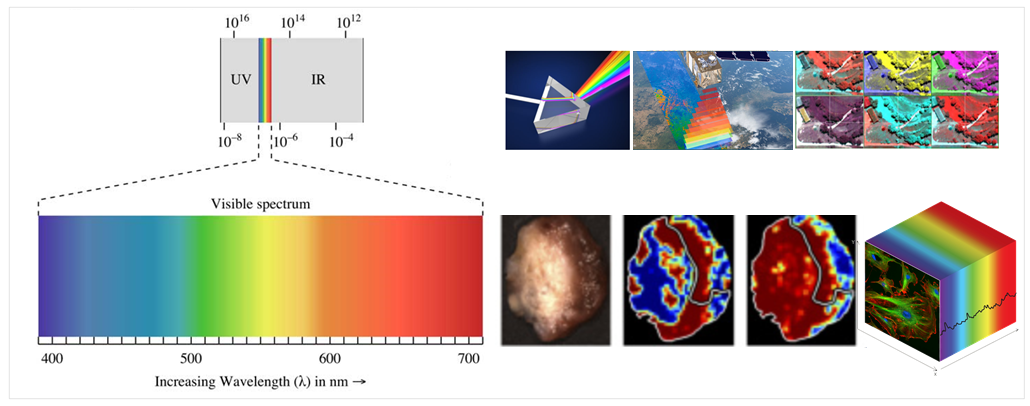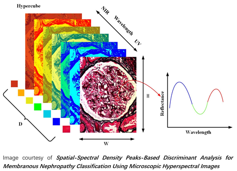 如下图所示的医学高光谱影像分析环节,研究人员将二维的图像信息和一维的光谱信号结合为一个三维立方体,表征样本结构的同时也反映了不同特性生物组织的光谱信息,有助于区分不同的病理组织成分: