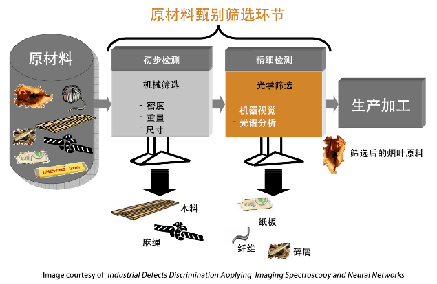 在食品、饮料、烟草或农产品分析筛选应用中,经过第一道人工采摘环节或制造工序后的原料中有时会混杂着较多的外部杂质,且部分产品良品与劣品之间的外形比较近似,无明显的外形区分特征,对快速、精准的工业化筛选带来了不小的挑战