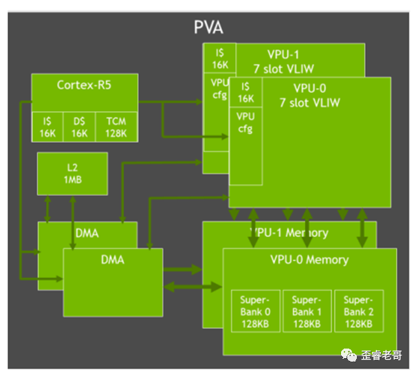 PVA用了VPU的架构,使用VLIW的架构,VLIW是超长指令字结构,其并行度比较好,VIEW架构设计简化了硬件结构,其二,VLIW的大位宽执行并不会以牺牲性能和频率为代价。但是同时将问题交给了软件来运行。