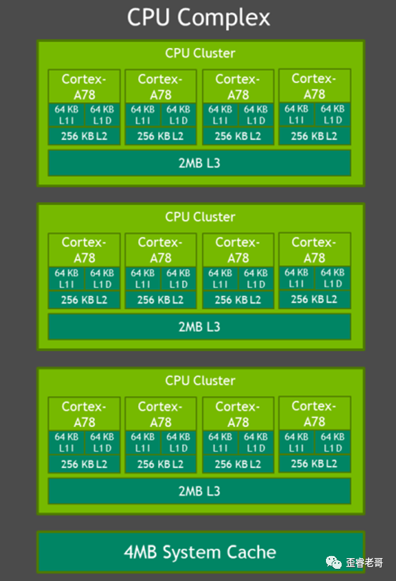 JESTON其内部有3组4核的A78,频率可以到2Ghz。也就是说,这个芯片内部有12核的A78的处理器,不同于手机的处理器,3个cluster的A78是对称的,不是手机处理器的大小核设计,其主要是面向计算服务,而不是手机应用中不同负载的低功耗。在一些标量的运算中,多核A78的计算能力也是非常强悍。