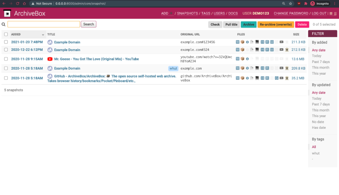 archivebox server 0.0.0.0:8000 # use the interactive web UI