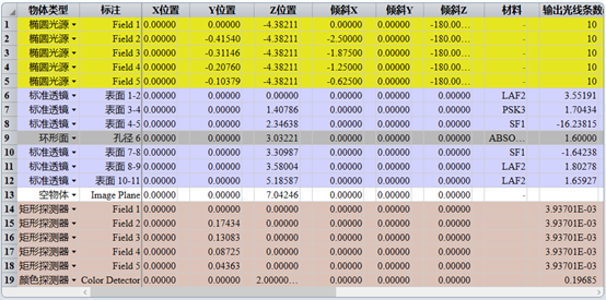 这个功能相对于其余的软件序列与非序列之间转化也是无缝衔接了。那么视场外的光束如何设置呢?在序列中设置好,然后转化过来不就好了?自然是不行的,转化的时候会告诉你光线追迹有误的。接下来,看我们看看自动转化的视场光,倾斜X这一栏就是我们ZEMAX中的视场,那么第一行到第五行就是我们视场内的光束了。